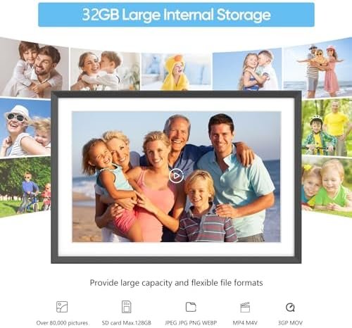【Wifi Smart Picture Frame】: Connect the electronic picture frame to WiFi network , download the Free FRAMEO app on the phone. then you can privately and safely share photos or videos with family from anywhere and anytime. Built-in 32GB memory and allows to insert SD card(max. 128G, not included), enabling you to read files and export, and back up the received photos and videos for better album management.