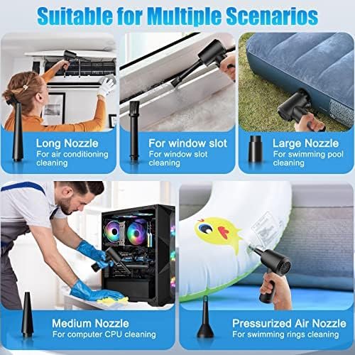 【Multiple Nozzles & Wide Application】BOLNGLA computer air duster comes with 5 sets of nozzles, meeting different needs. Suitable for dust removal of computer cases, keyboards, cars, fans, lily windows, etc. The multifunctional nozzle is used to inflate swimming rings, yoga balls, steamboats, air mattresses, inflatable toys, etc.