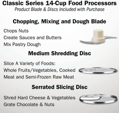 The Cuisinart DFP-14BCNY custom food Processor has an extra-large Feed tube that holds whole fruits and vegetables. Features a 14-Cup work bowl, 4mm stainless steel Medium slicing disc, stainless steel shredding disc, and chopping/mixing blade. Includes a spatula and recipe book.