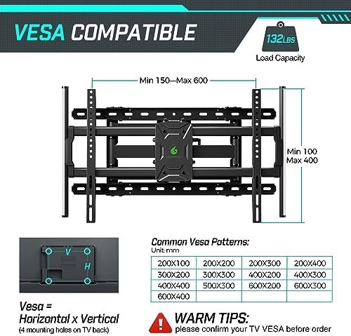 Universal Design: Greenstell tv wall mount fit most 47-84 inch LCD, LED, or plasma flat/curved screens with VESA pattern from 200x100mm, 200x200mm, 300x200mm, 300x300mm, 400x300mm, 400x400mm, 600x200mm, 600x300mm, 600x400mm. It is compatible with TV brands such as Samsung, Sony, Sharp, TCL, LG, Vizio, etc