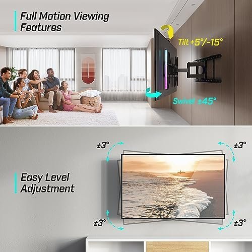 Full Motion TV Mount: Tilting your TV screen up 5° and down 15° to reduce glare, swivel tv ±45° and level adjusts ±3° for maximum viewing flexibility. Retract 3.4” for space saving, extend 14.6” from wall for optimal positioning. Greenstell tv wall mount can help you feel comfortable during tv time at family gatherings