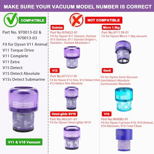 NOT COMPATIBLE – These V11 replacement filters for Dyson are NOT compatible with Dyson Gen5 Detect, Gen5 Outsize, V11 Outsize, V15 Outsize, Outsize Vacuum, Outsize+/Plus, Outsize Absolute+, SV19 Omni-glide +, V12 Slim, SV16, Micro 1.5KG, Cyclone V10 Animal, V10 Absolute, V10 Cyclone, V10 Total Clean, SV12 vacuums. Please confirm your accessories model and size before order! For more details refer to the product picture.