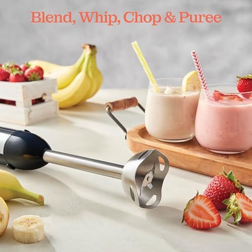 Powerful Blender – The hand blender has a motor of 500 watts and 4 sharp blades, grinding unruly lumps, stubborn clumps, tough meats, and rock-hard fruits for smoothies, soups, milkshakes, and batters.
