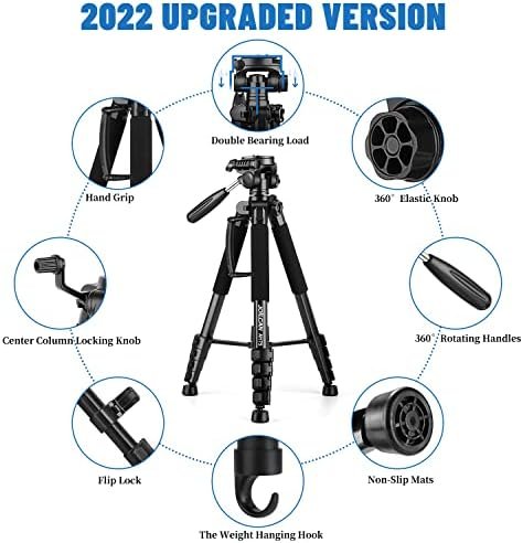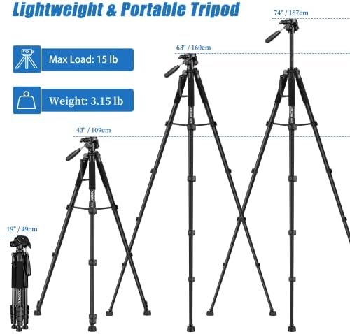 【 Widely Application】 The heavy duty 74 inch camera tripod is suitable for photographing events and video recordings such as selfies, family portrait photos, parties, traveling, hiking, sports, YouTube, Vlog, video conferencing, online meetings, live streaming, recording games, yoga videos, outside with wind, and other activities indoors and outdoors. 3-position leg angle adjustment system helps you take photos flexibly for different scenarios and photography conditions.