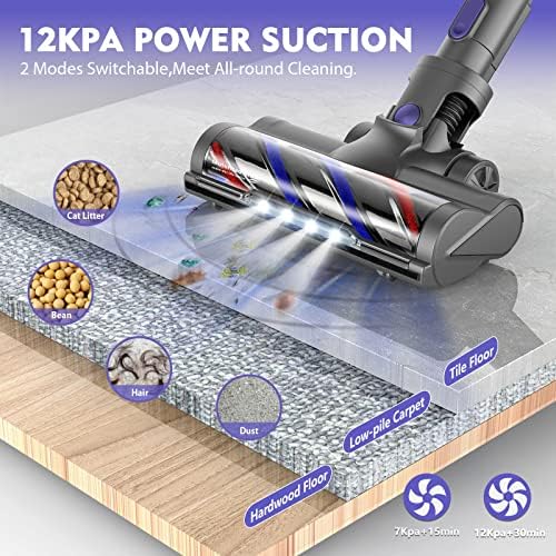 🌀【Adjustable Dual Suction Vacuum Cleaner】: The lightweight cordless vacuum cleaner has 2 speed levels, allowing you to easily switch between the highest mode 12kPa (20 mins), the standard mode 7kPa (30 mins). Meet your various cleaning needs of pet hair, fine dust, crumbs, large particles on hardwood floors, tile floors, marble floors and low pile carpets, etc. (Note: Not suitable for high pile rugs.)